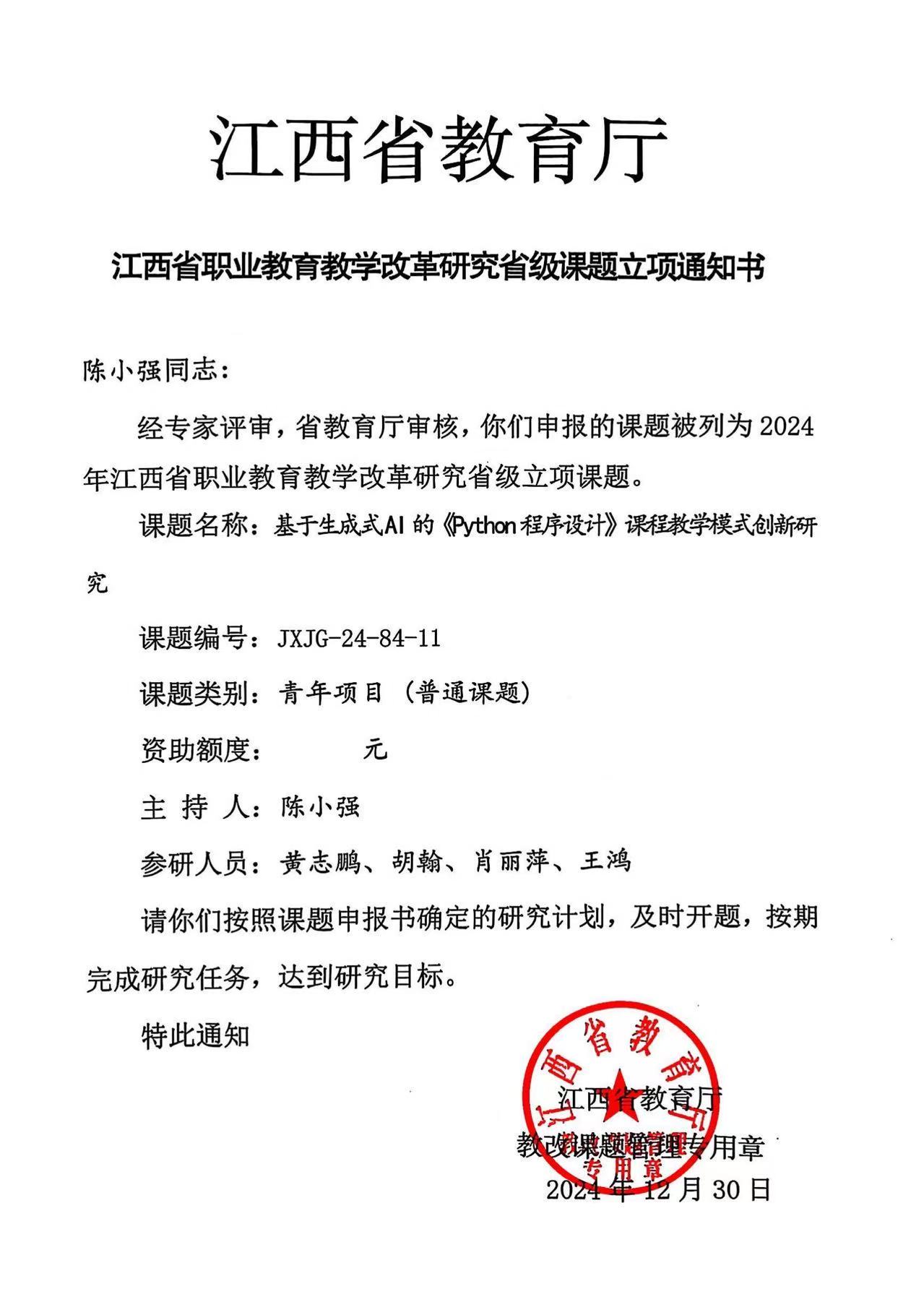 近日,2024 年江西省职业与成人教育教学改革课题立项结果揭晓,吉安职业技术学院人工智能技能大师工作室领办人陈小强主持的《基于生成式 AI 的〈Python 程序设计〉课程教学模式创新研究》成功获批。