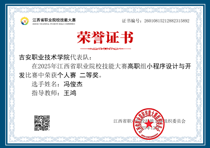 2026年1月21日讯 —— 2025年江西省职业院校技能大赛“高职组小程序设计与开发”赛项于12月20日至21日在江西电力职业技术学院成功举办。本次赛事由江西省教育厅主办,吸引了来自全省各高职院校的92支参赛队伍、共计92组选手同台竞技,充分展现了新时代高职学子在移动应用开发领域的技术实力与创新精神。